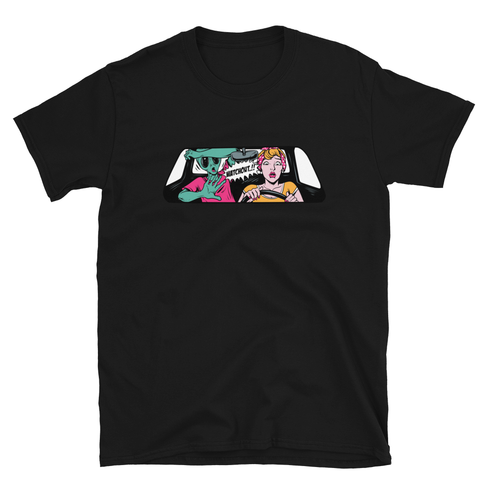 Life is a highway and the last year has been a wild ride! These bright colors make this design truly POP. When it comes to your style, take the wheel and drive! This t-shirt also features a fun sci-fi twist.