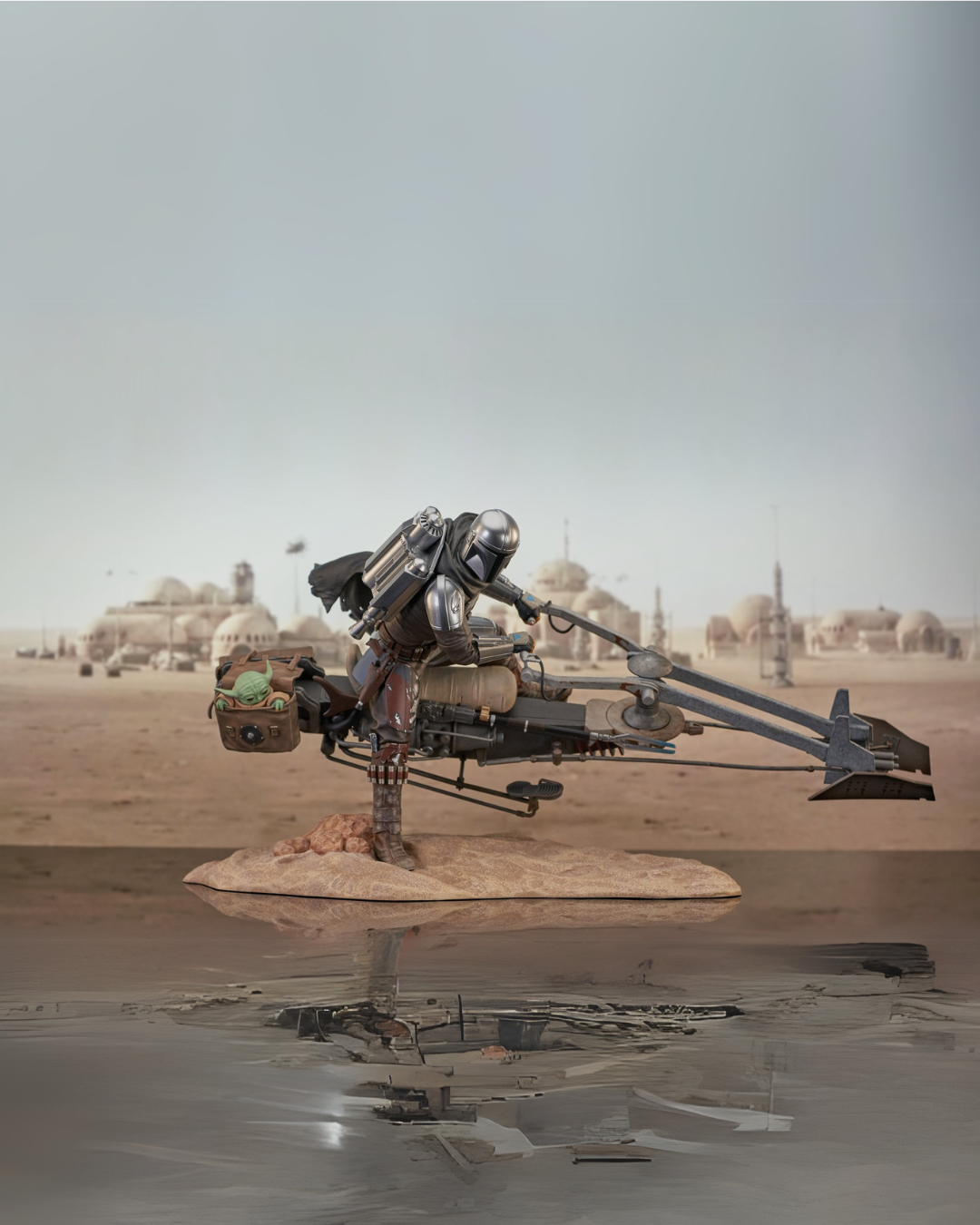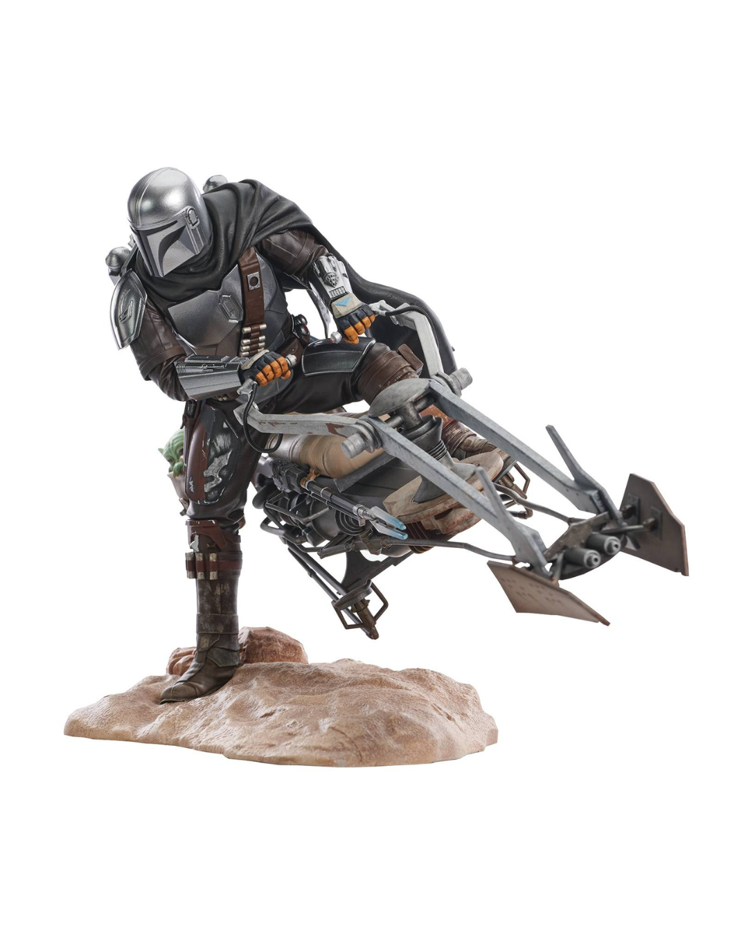 A Gentle Giant LTD release! This is the big one! At 9 inches tall and over a foot long, this 1/7 scale statue of Din Djarin astride a speeder bike is the crown jewel in any Mandalorian statue collection. With Grogu hanging out of a pouch on the back of the bike, and one of Din's feet touching the ground to pivot his attack, this statue is limited to only 1000 pieces and comes packaged with a numbered certificate of authenticity in a full-color box.