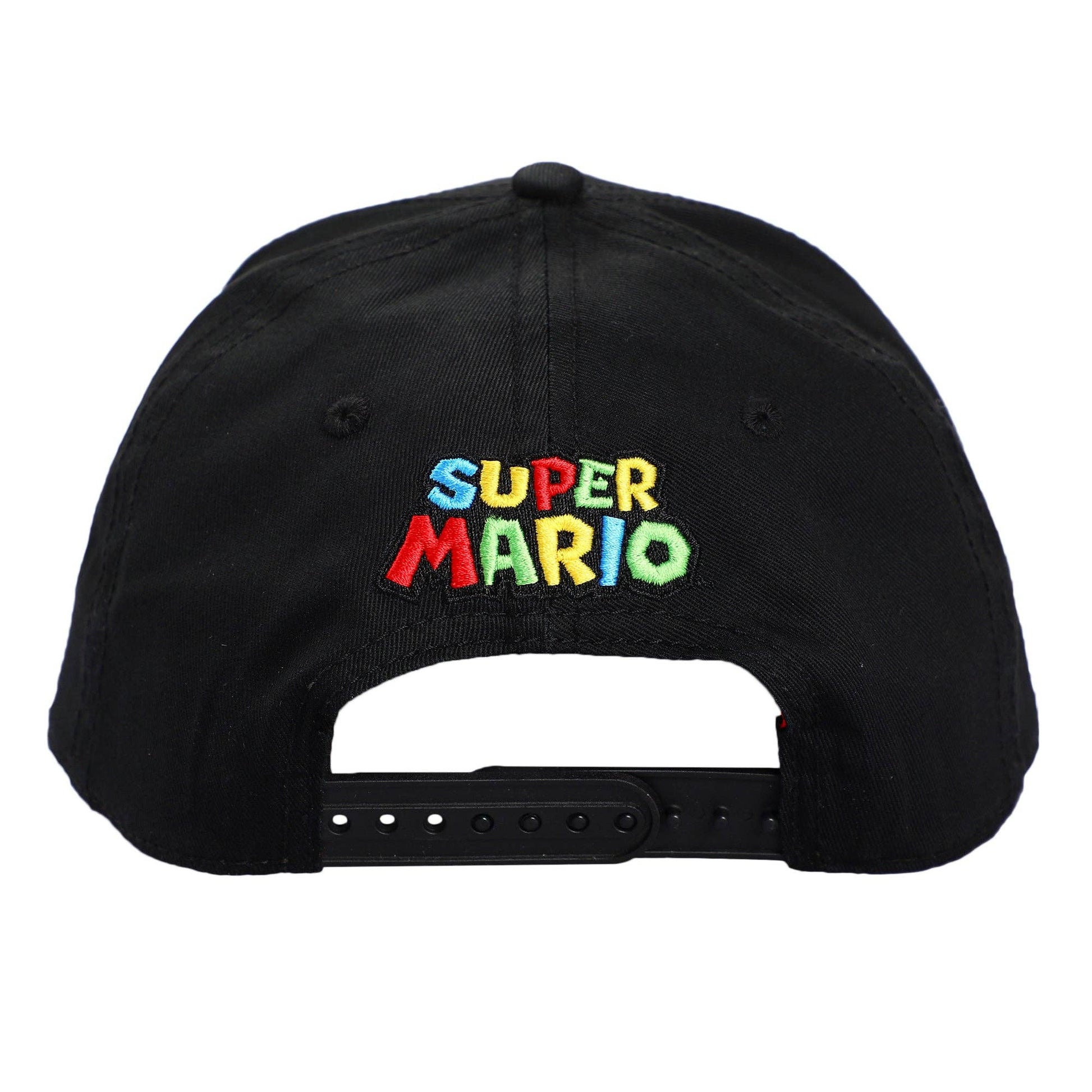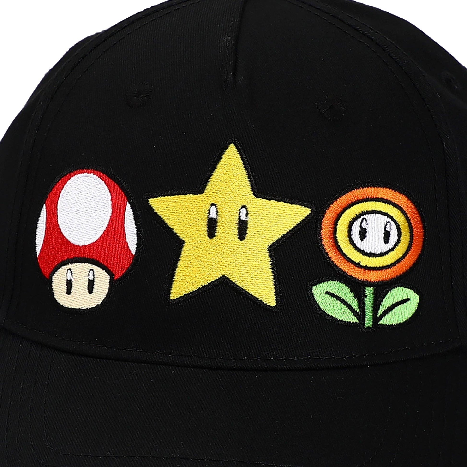 Power up your style with this Super Mario Brothers hat. The cap comes in black and features embroidered front art of a mushroom, a star, and a fire flower. The hat is made with high-quality cotton materials and comes with an adjustable strap to help you find the best fit. Super Mario Brothers fans will love this comfy cap.