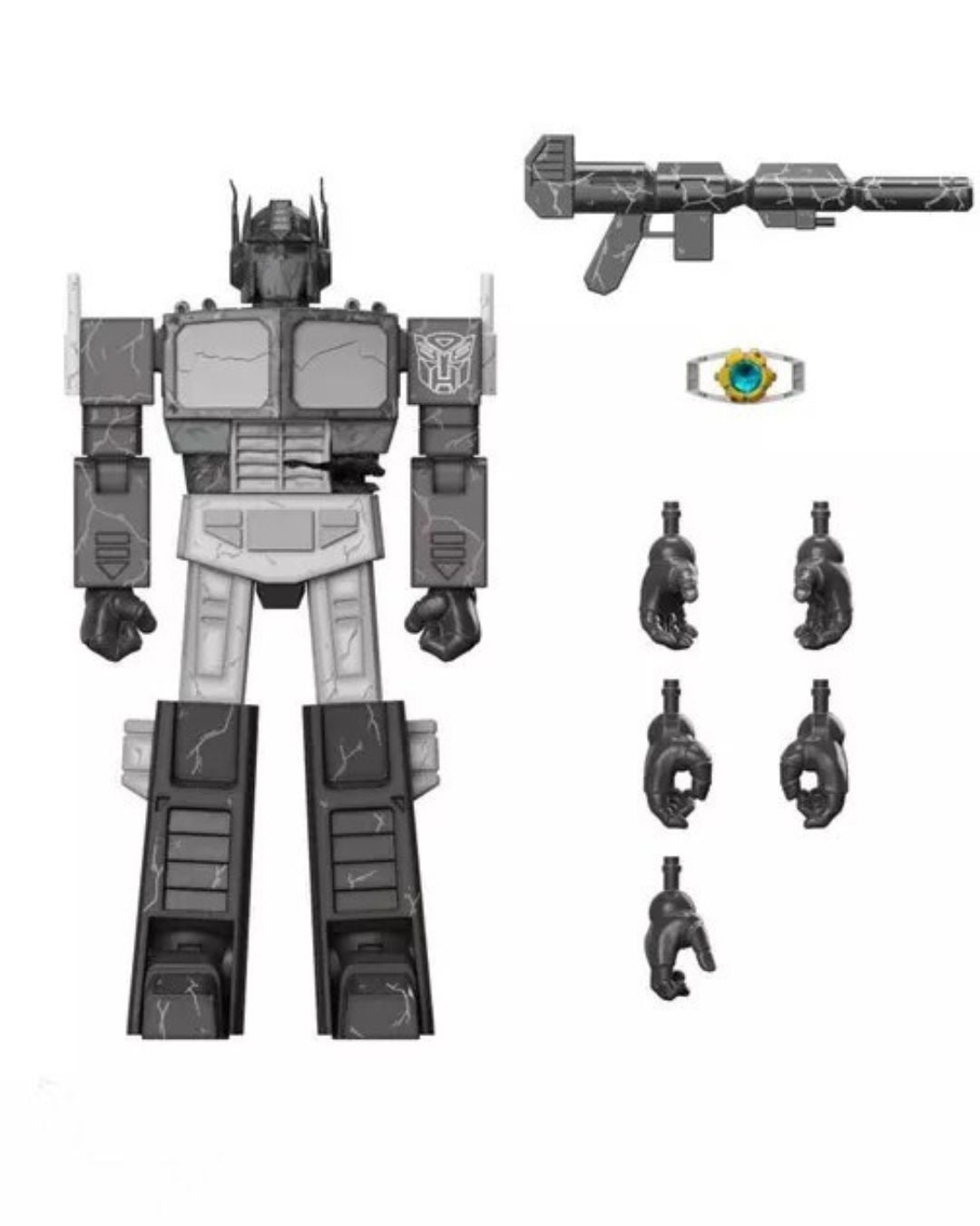 This 7” scale highly articulated, intricately detailed Transformers ULTIMATES! figure of Fallen Leader Optimus Prime is inspired by his emotional-damage-inflicting death in The Transformers: The Movie and features a new grayscale battle-damaged torso with cartoon-accurate matrix storage chamber inside his chest, and comes with multiple interchangeable hands, his blaster, and the Matrix of Leadership.