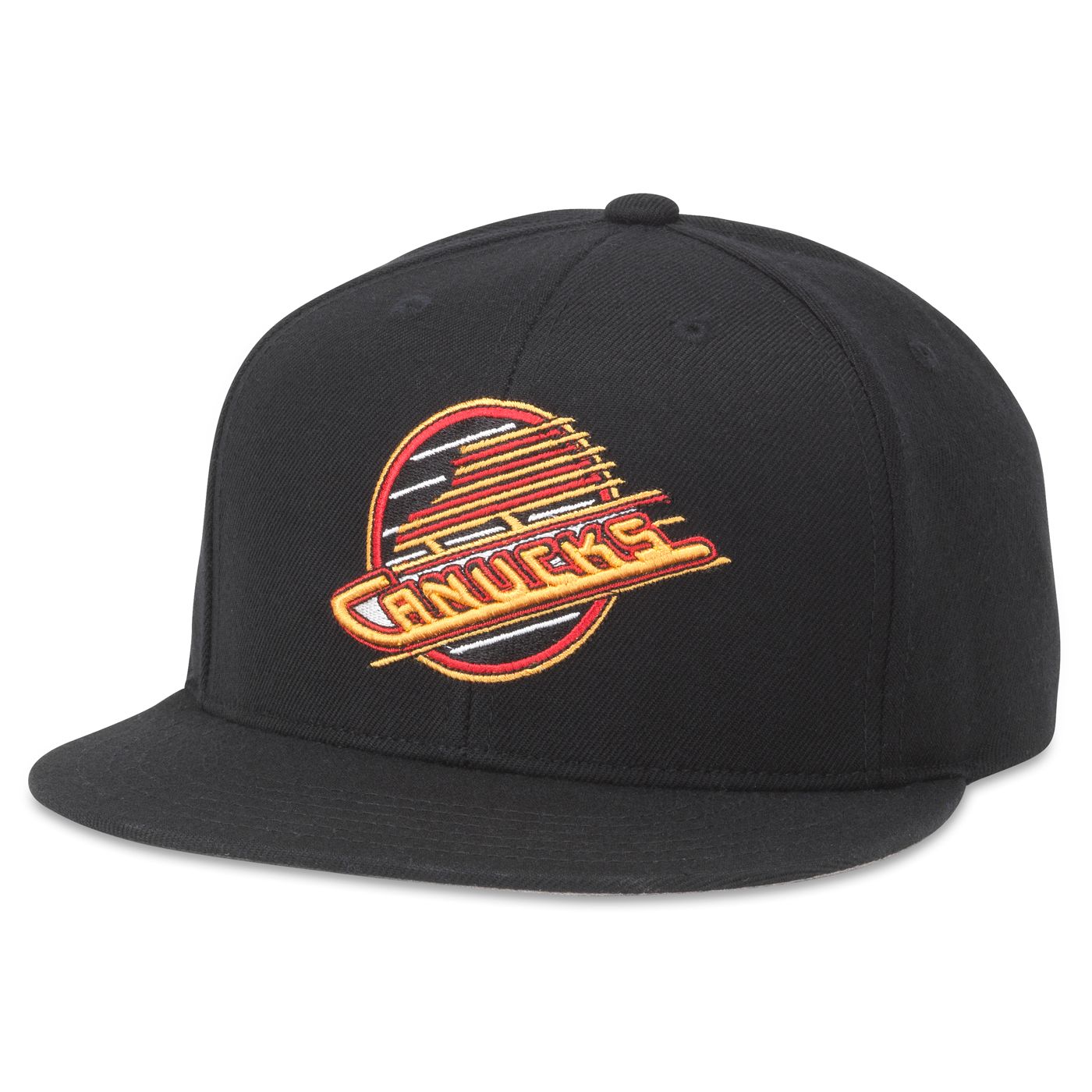 Wool blend crown and flat visor, lofted embroidery, classic plastic snapback closure.