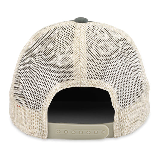Pigment washed cotton twill cap with soft structured crown, soft mesh sides and back. Plastic snap back strap. Front logo is washed twill merrowed patch with embroidery and matte print details.